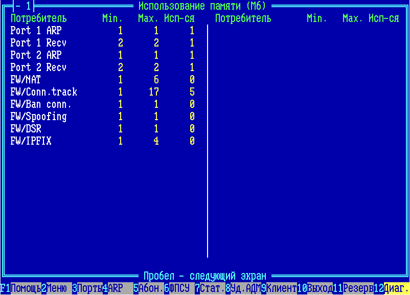 Сетевой пул — количество памяти в ethernet пакетах (фреймах), область выделенная в оперативной памяти ФПСУ, в которую сетевая карта помещает полученные фреймы. Размер пула указан в строке «Сетевой пул». Первое значение - сколько свободных частей памяти для фреймов есть в пуле, второе значение - размер пула. Как правило, один фрейм занимает одно значение в пуле. В зависимости от версии ФПСУ и конфигурации аппаратуры пулов может быть несколько. ФПСУ назначает пул каждому порту. Двум разным портам может быть назначен один и тот же общий пул, а могут быть назначены и разные пулы. Когда ФПСУ получает фрейм, для него выделяется часть памяти из пула, в зависимости от стадии обработки фрейм проходит несколько стадий: Буфер приёма, Буфер обработки и Буфер передачи, после отправки фрейма часть памяти освобождается и снова попадает в пул. Для буферов выводится два значения. Первое значение буфера - сколько фреймов находится в очереди на данной стадии (0 - буфер пустой, нет фреймов в очереди), второе значение - размер буфера, максимально возможное количество фреймов, обрабатываемых на данной стадии. В целях оптимизации скорости работы освобождённая часть память может быть кэширована и не попасть обратно в пул, такая часть памяти не отображается, поэтому количество свободных фреймов в пуле может быть меньше размера пула, даже если ФПСУ простаивает. Кроме состояния портов ФПСУ, из данного окна доступен последовательный переход на два дополнительных экрана состояния, «Использование памяти» и «Мониторинг сетевых портов». По нажатию клавиши <Пробел> осуществляется переход в окно «Использование памяти»: