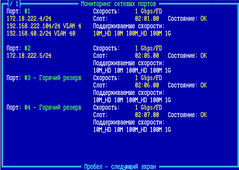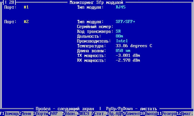 В окне выводится список портов, перемещение по списку осуществляется клавишами <PgUp>, <PgDn>. Для каждого сетевого порта выводится номер сетевого адаптера, скорость соединения, в слоте указаны параметры PCI-порта (bus:device.function), состояние сетевого адаптера (рабочее - ОК), IP-адрес порта и описатели VLAN. По нажатию клавиши <Пробел> осуществляется переход в окно «Мониторинг SFP модулей»: