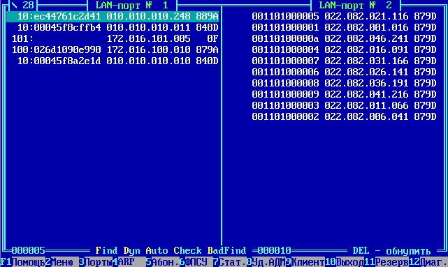 Цифры внизу («000005» и «000010» на рисунке) означают общее количество записей в ARP-кэше для каждого порта. Перемещение по списку записей осуществляется при помощи клавиш управления курсором <↑> и <↓>, а между половинами окна - при помощи клавиш <Tab>, <←> и <→>. Нажатие клавиши <Del> вызывает процедуру обновления ARP-кэша на ФПСУ. |
