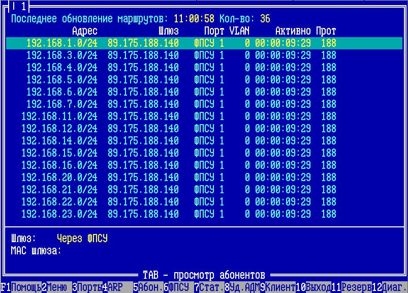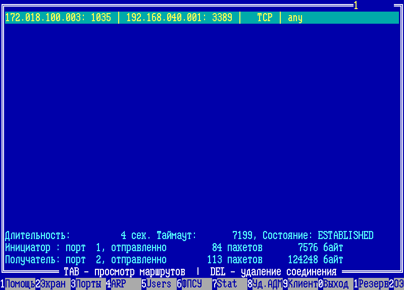 В записи указываются IP-адреса абонентов, между которыми происходит обмен пакетами, признак работы через ФПСУ (для левого адреса - с левой стороны, для правого адреса - с правой стороны), количество в байтах переданной и полученной информации для первого и второго порта и признак ошибки (если она имела место). Записи добавляются в конец списка, по мере добавления новых записей некоторые записи будут вытесняться (передвижения по строкам осуществляется с помощью клавиш управления курсором <↑> и <↓>). В нижней части экрана для записи, на которую установлен курсор, отображаются дополнительные сведения. Они разбиты на две половины, относящиеся к каждому порту. Указывается количество пакетов, принятых на обработку с данного порта, количество отказов, согласованное использование сжатия и криптозащиты и время последнего обмена пакетами между данными абонентами.