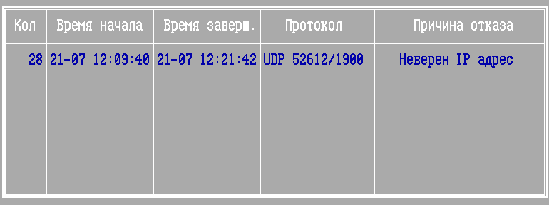 В окне отображаются количество отказов для данной пары абонентов, дата и время первого и последнего отказов, протокол, которому принадлежат пакеты, и причина отказа. Могут быть указаны следующие причины: