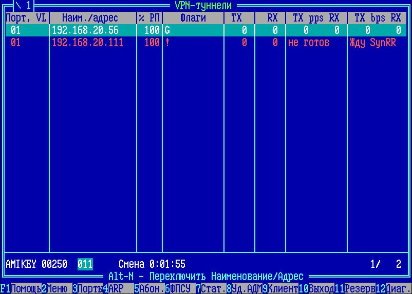 WaitSynRR - прием и передача данных абонентов невозможны, ожидается разрешение синхронизации от удаленного ФПСУ. Отображается в случаях ошибок с парно-выборочными ключами на текущем или удаленном ФПСУ (например, не согласованность конфигураций ФПСУ в используемых номерах ключевых данных, серии или криптосети; ошибки чтения файла с ключевыми данными). Также отображается, когда по указанному IP-адресу находится не ФПСУ, а другое устройство, с которым невозможно установить VPN-туннель;