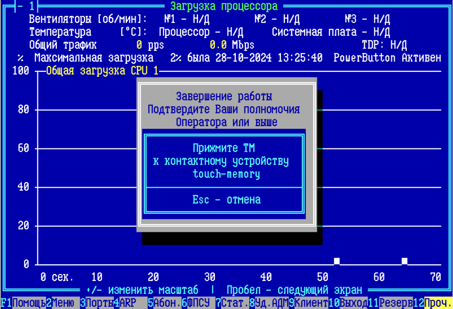 Команда «Запуск ФПСУ» разрешена допущенным лицам любых классов и выполняется самостоятельно при включении питания ФПСУ в случае задействованной подсистемы автозапуска. Без подсистемы автозапуска команда «Запуск ФПСУ» из главного меню доступна администраторам класса Оператор и выше (см. пункт «Разграничение доступа и пользователи»). При выполнении операции необходимо подтверждение полномочий посредством подключения TM-идентификатора администратора к USB-порту ФПСУ, кроме того, вход может быть защищен паролем подключаемого ТМ, в этом случае будет запрашиваться пароль подключенного ТМ-идентификатора для авторизации. Если к ФПСУ подключен монитор, во время работы подсистемы фильтрации на экран выводится справочная информация о состоянии сетевых адаптеров, о состоянии ARP-таблицы, о работе подсистемы фильтрации, о взаимодействии с другими ФПСУ и др. Переключение режимов отображения осуществляется по нажатию функциональных клавиш, информация о назначении которых помещена в статусной строке экрана: F1 – вывод на экран окна справки о назначении клавиш, информации о версиях (версии и сборке ПО ФПСУ, модели материнской платы), информации об установленных подсистемах (а также количестве ядер процессора), информации об дополнениях (dhcp, http-proxy). F2 – вывод на экран меню управления ключами удаленных администраторов; F3 – переход на экран отображения состояния сетевых адаптеров рабочих портов; F4 – переход на экран отображения состояния работы ARP-протокола; F5 – переход на экран отображения подсистемы фильтрации пакетов абонентов; F6 – переход на экран отображения состояния взаимодействия с удаленными ФПСУ‑IP; F7 – переход на экран просмотра накопленной за текущие сутки статистики или динамического отображения аппаратного состояния ФПСУ (переключение между режимами осуществляется посредством клавиши <Пробел>); F8 – переход на экран отображения взаимодействия с удаленными администраторами; F9 – переход на экран отображения состояния связи с клиентами ФПСУ; F10 – команда завершения работы режима фильтрации и перехода в режим конфигурирования; F11 – переход на экран отображения состояния «горячего» резервирования; F12 – переход на диагностический экран для отображения отладочной информации о текущей работе ФПСУ; ALT+M – нажатие сочетания клавиш включает или отключает вывод на текущий экран мониторинга всплывающих окон с сообщениями о нарушении правил фильтрации. В верхней строке экрана отображаются текущая версия ПО ФПСУ, текущий статус ФПСУ в процессе «горячего» резервирования, время с момента последнего запуска подсистемы фильтрации и текущее время на ФПСУ. Для завершения работы режима фильтрации и перехода в режим конфигурирования к главному меню ФПСУ (например, с целью проведения конфигурационных работ или просмотра статистики) нажмите клавишу <F10>, сочетание клавиш <Alt+X> или <Ctrl+Alt+Del>. При попытке выполнении команды потребуется подтвердить полномочия оператора или администратора: