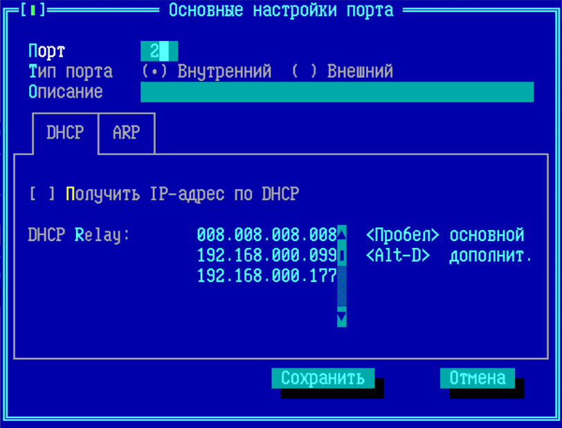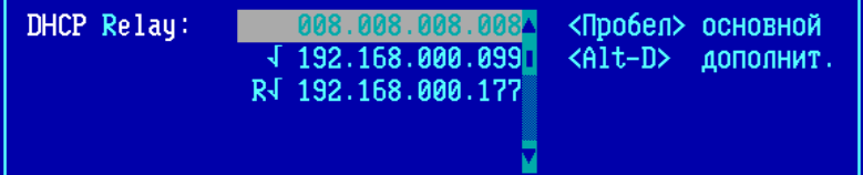 В списке DHCP-Relay можно выбрать основной и запасной DHCP-сервер для ретрансляции всех DHCP-запросов, поступающих на описываемый порт ФПСУ. Для указания адреса основного DHCP-сервера данного порта, выберите курсором строку и нажмите клавишу <Пробел>. Запись адреса основного DHCP-сервера будет выделена знаком «√». После установления адреса основного DHCP-сервера, можно выбрать ещё один адрес, куда будет ретранслироваться полученный портом запрос. Для этого следует в окне DHCP-Relay выбрать курсором строку с IP-адресом и нажать сочетание клавиш <Alt+D>. Запись адреса дополнительного DHCP-сервера будет выделена знаком «R√».