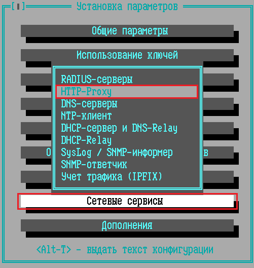 На ФПСУ может быть включен режим HTTP и SOCKS прокси (по умолчанию, прокси отключен). Для перехода в окно управления этими режимами, выполните команду «Сетевые сервисы» → «HTTP-Proxy» меню конфигурации ФПСУ: