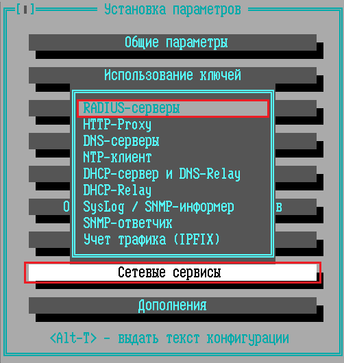 Доступ к окну настроек RADIUS-серверов на ФПСУ предоставляется из меню «Сетевые сервисы» конфигурации ФПСУ при выборе в подменю команды «RADIUS-серверы».
