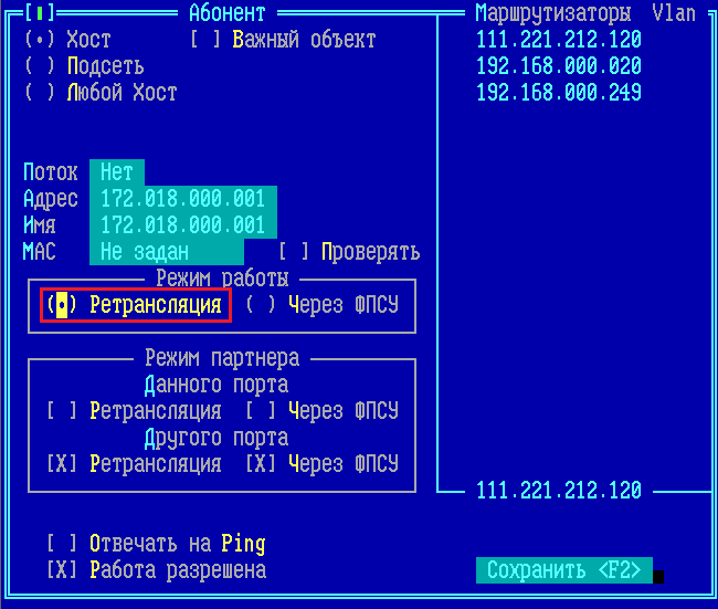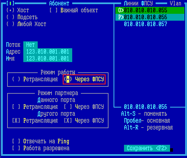 Использование основной и резервной (запасной) линий ФПСУ Для каждого описываемого абонента может быть установлено дополнительное правило фильтрации по режиму работы с другими зарегистрированными на настраиваемом ФПСУ абонентами, которые называются партнерами описываемого абонента. Настраивается в поле «Режим партнера». Режим партнера - режим работы, указываемый для партнера (абонента), с которым может обмениваться пакетами данный абонент. Знак [X] около соответствующей строки означает отсутствие для данного абонента принципиального запрета возможности работать с партнерами, для которых установлен указанный режим работы на одном из портов. Партнер данного порта — это абонент, зарегистрированный на том же логическом порту ФПСУ, что и описываемый абонент (например, при добавлении абонента на логический порт с номером 1 партнерами данного порта являются все абоненты, описанные на логическом порте с номером 1 настраиваемого ФПСУ). Партнер данного порта в режиме «Ретрансляция» — это абонент, зарегистрированный на том же логическом порту, что и описываемый абонент, который подключен к настраиваемому ФПСУ напрямую. Например, на рис. «Режим работы партнеров абонента» для ФПСУ С и описываемого на нем «Абонента а1» партнером данного порта в режиме ретрансляция является «Абонент In1» или «Абонент In2»; для ФПСУ B и описываемого «Абонента a2» таким партнером является «Абонент b2». Партнер данного порта в режиме «Через ФПСУ» — это абонент, зарегистрированный на том же логическом порту, что и описываемый абонент, который подключен к настраиваемому ФПСУ через установленный VPN-туннель с другим ФПСУ. Например, на рис. «Режим работы партнеров абонента» для ФПСУ С и описываемого на нем «Абонента с1» партнером данного порта в режиме «Через ФПСУ» является «Абонент b2» или «Абонент а1»; для ФПСУ А и описываемого на нем «Абонента b1» таким партнером является «Абонент In2» или «Абонент с2». Партнер другого порта — это абонент, зарегистрированный на другом логическом порту ФПСУ относительно описываемого абонента (например, при добавлении абонента на первый логический порт партнерами другого порта являются все абоненты, описанные на втором логическом порту). Партнер другого порта в режиме «Ретрансляция» — это абонент, зарегистрированный на другом логическом порту ФПСУ относительно описываемого абонента, который подключен к настраиваемому ФПСУ напрямую. Например, для ФПСУ В и описываемого «Абонента b1» партнером другого порта в режиме «Ретрансляция» является «Абонент In1» или «Абонент In2»; для ФПСУ С и описываемого «Абонента с1» таким партнерами тоже являются «Абонент In1» или «Абонент In2». Партнер другого порта в режиме «Через ФПСУ» — это абонент, зарегистрированный на другом логическом порту ФПСУ относительно описываемого абонента, который подключен к настраиваемому ФПСУ через установленный VPN-туннель с другим ФПСУ. Например, для ФПСУ А и описываемого «Абонента а1» партнерами другого порта в режиме «Через ФПСУ» являются «Абонент с1» или «Абонент in1»; для ФПСУ С и описываемого «Абонента с2» такими партнерами являются «Абонент а2» или «Абонент b2». Режим партнера устанавливается отдельно для каждого абонента порта комплекса, причем: •для партнера со стороны данного (своего) порта могут быть разрешены один или оба режима, а отказ от обоих режимо