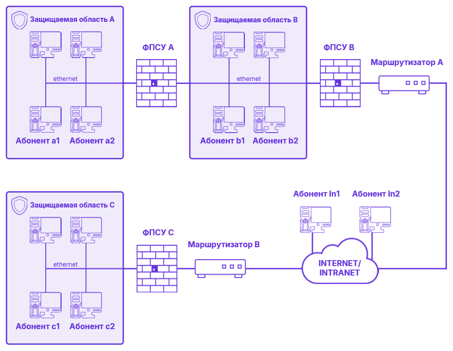 Важный объект – флаг в положении «включено» запрещает удалять описание абонента из интерфейса портов ФПСУ. Признак «Важный объект» добавлен как дополнительная защита от случайного удаления записи при редактировании конфигурации. VLAN – номер виртуальной локальной сети, в которой участвует данный IP-адрес, если требуется. Только для абонентов в режиме «Ретрансляция». Адрес – IP-адрес рабочей станции. Имя – имя абонента, которое будет отображаться в списке. МАС – Только для абонентов в режиме «Ретрансляция». Статически заданный аппаратный адрес для этого абонента. Если параметр задан, ФПСУ будет отправлять пакеты в адрес этого абонента именно на указанный аппаратный адрес, вне зависимости от приходящих на ФПСУ ARP-пакетов от IP-адреса абонента. Проверять MAC – Только для абонентов типа «Хост», работающих в режиме «Ретрансляция». Требует заполненного поля «MAC». При включении опции ФПСУ проверяет полученные от IP-адреса абонента пакеты на соответствие указанному MAC-адресу. Если MAC-адрес полученного пакета от IP-адреса описываемого абонента не совпадает с указанным в поле «MAC», пакет будет сброшен. Поток – для описываемого абонента можно установить номер потока (от 1 до 128), в который будут направлены обмены абонента при передаче данных в туннеле между ФПСУ. Режим работы: «Ретрансляция» (фильтрация без аутентификации) или «Через ФПСУ» (обмен между абонентом и портом ФПСУ будет производиться через туннель со смежным ФПСУ. В этом режиме возможно включение механизмов шифрования и/или сжатия передаваемых данных). •«Ретрансляция» (обмен данных ФПСУ с абонентом осуществляется без шифрования, соединения с ним только фильтруются межсетевым экраном). Выберите этот режим, если описываемый абонент подключен к настраиваемому ФПСУ напрямую, то есть пакеты от него приходят в обычном виде, а не через VPN-туннель. Например, на рисунке ниже для ФПСУ А это будут абоненты «а1», «а2», «b1»и «b2»; для ФПСУ B это будут абоненты «b1», «b2», «In1» и «In2»; а для ФПСУ C это будут абоненты «с1», «с2», «In1» и «In2». При выборе режима «Ретрансляция» в правой части окна будет отображаться список маршрутизаторов, описанных со стороны данного порта. Если абонент доступен через какой-либо маршрутизатор, то такой маршрутизатор следует отметить нажатием клавиши <Пробел> (если в списке нет маршрутизаторов, необходимо сначала описать их). Заметим, что администратор может регламентировать нагрузку на маршрутизаторы, приписывая различных абонентов к определенным маршрутизаторам. При передаче IP-пакетов описываемому абоненту ФПСУ будет учитывать ICMP сообщения переадресации (см. пункт «Описание параметров туннелей с другими ФПСУ»).