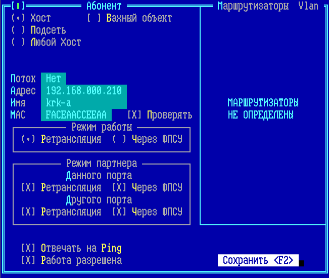 •Тип записи: Хост; •Адрес: 192.168.000.210; •MAC: FACEAACCEEAA •Флаги поле «Режим партнера», «Отвечать на Ping», «Работа разрешена» – установлены. |