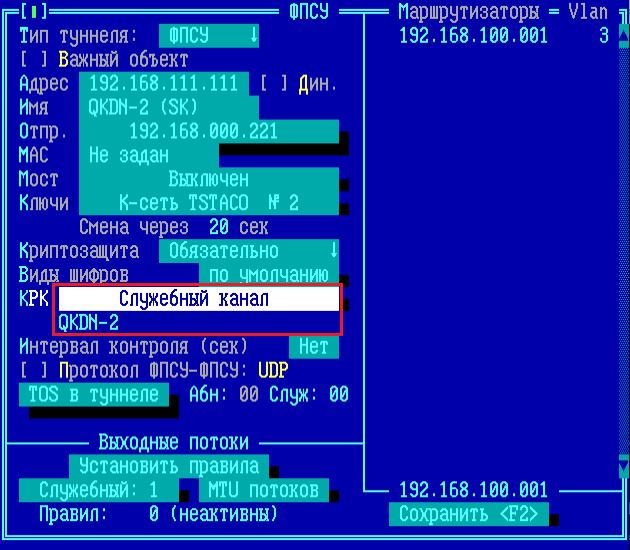 По служебному туннелю передаются также служебные сообщения между ФПСУ, предназначенные для обслуживания туннеля. Идет ли обмен по служебному туннелю между СВКРК или нет можно сказать по интенсивности трафика в туннеле. В нормальном режиме при активном обмене между устройствами СВКРК передается служебный трафик порядка 200 pps и не менее 0,1 Mbps. Без трафика СВКРК в туннеле передаются только служебные данные между ФПСУ, несколько пакетов в секунду.