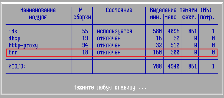Дополнение frr включает динамическую маршрутизацию на ФПСУ. Подробное описание динамической маршрутизации приведено в разделе «Динамическая маршрутизация». Для установки дополнения требуются файлы frr_installer_b14.up0, frr_installer_b14.upd. Установка дополнения производится в соответствии с пунктом «Установка дополнений/изменений». Для удаления дополнения frr выполните команду «Настройка дополнений → Удаление дополнений → frr », после удаления дополнения ФПСУ будет перезагружен. Проверить установленное дополнение ФПСУ можно в режиме фильтрации, нажав на функциональную клавишу <F1> и выбрав пункт «Информация об аддонах».
