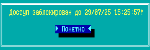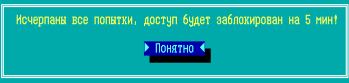 В случае исчерпания 10 попыток ввода пароля ТМ доступ на ФПСУ будет заблокирован на 5 минут и будет выдано сообщение: