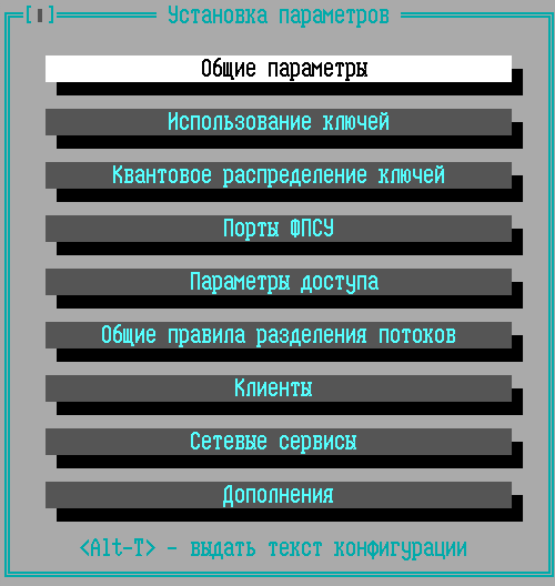 Команда главного меню «Конфигурация ФПСУ» предназначена для задания правил фильтрации, режимов работы механизмов аутентификации, сжатия, криптозащиты, правил взаимодействия с клиентами, а также для установки параметров работы ФПСУ: