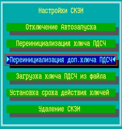 Команда «Переинициализация доп. ключа ПДСЧ» подменю «Настройки СКЗИ» предназначена для повторной инициализации программного датчика случайных чисел ФПСУ для КРК. Дополнительный ключ ПДСЧ используется в ККС ВРК. Переинициализация дополнительного ключа ПДСЧ выполняется средствами биологического датчика случайных чисел. Для успешного выполнения команды, к ФПСУ должен быть подключен манипулятор типа «мышь». Инициализация может быть запущена несколько раз для формирования нескольких дополнительных ключей ПДСЧ для КРК.