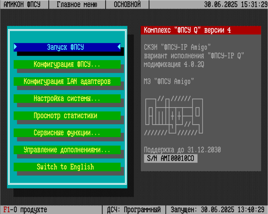 После перезагрузки откроется главное меню ФПСУ, при успешной установке лицензии комплексу присваивается серийный номер, информация о серийном номере выводится в открывшемся окне (справа внизу). После присвоения серийного номера ФПСУ станут доступны все команды главного меню.