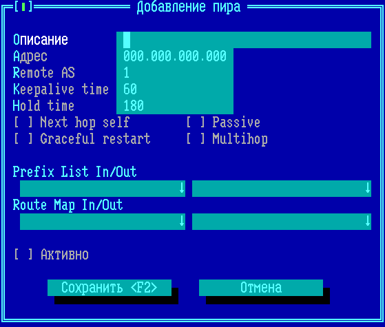 В окне «Настройки динамической маршрутизации BGP» находятся вкладки с настраиваемыми параметрами протокола. Переход с активной вкладки на соседнюю осуществляется установлением курсора на вкладку и нажатием сочетаний клавиш <Ctrl →> и <Ctrl ←> или клавиш <→> и <←>. Для включения ФПСУ в протокол BGP требуется указать номер автономной системы Local AS и идентификатор Router ID, включить протокол на вкладке «General», задать соседей на вкладке «Peers». Конфигурация протокола BGP записывается в файл bgpd.conf после запуска ФПСУ (см. пункт «Дополнения»). На каждой вкладке необходимо указать обязательные для настройки протокола BGP параметры: •BFD Для выхода в меню с сохранением настроек протокола BGP, нажмите кнопку «Сохранить» или клавишу <F2>. Для выхода без сохранения настроек нажмите клавишу <Esc>. |