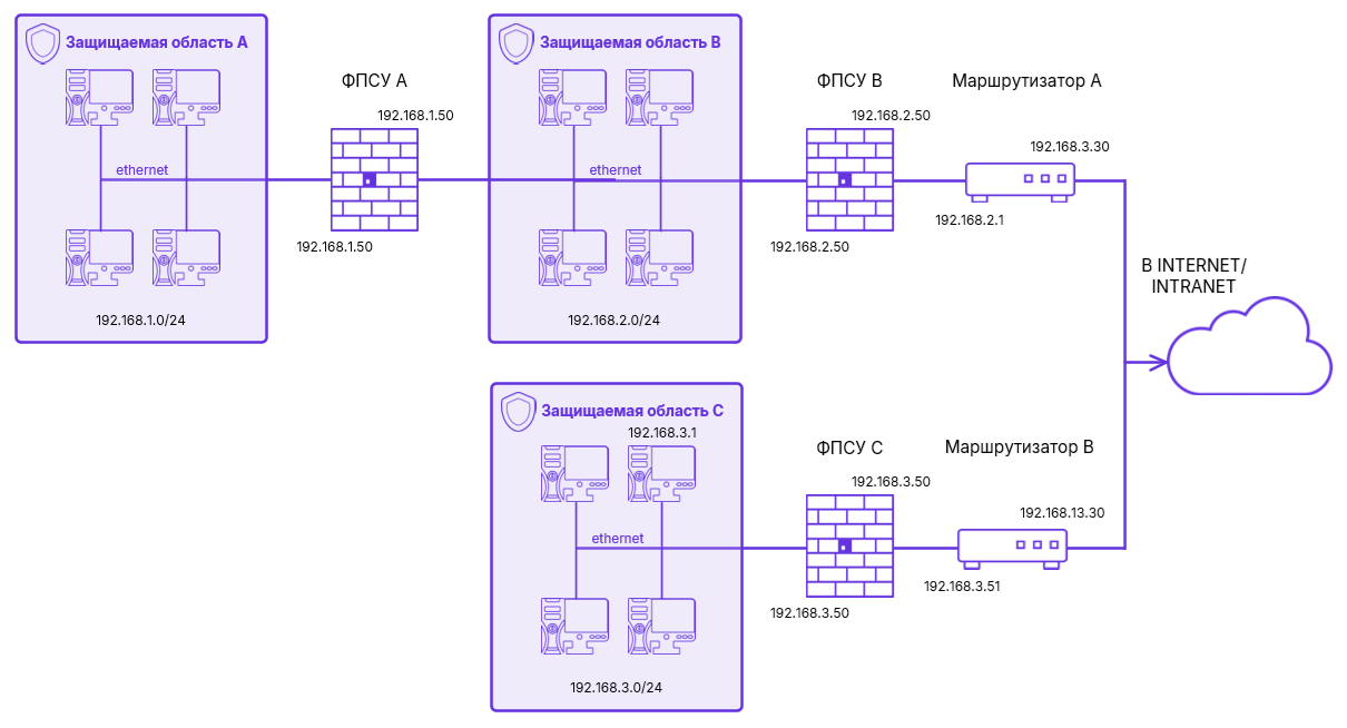 Доступ от абонентов области А к абонентам области С осуществляется через ФПСУ В, задан правилом трафика, разрешающим доступ в область С.