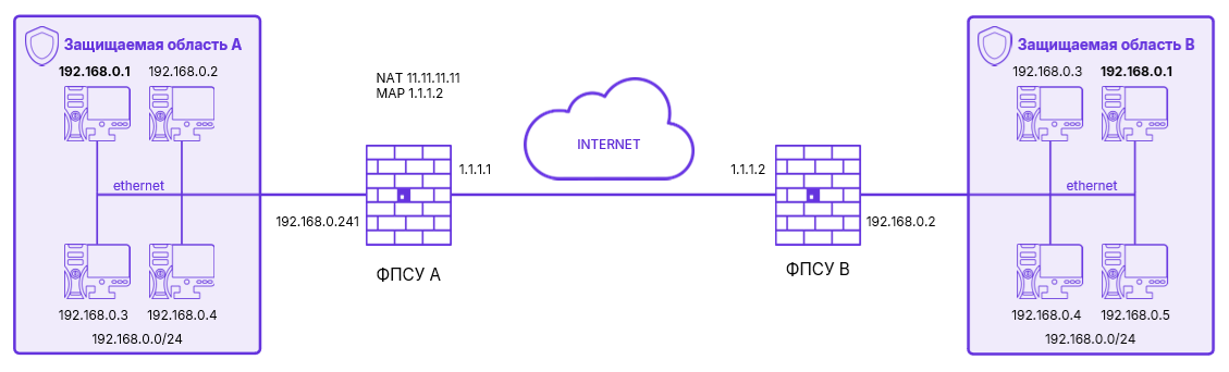 Хост 192.168.0.1 защищаемой области А отправляет эхо-запрос (ping) на внутренний IP-адрес ФПСУ А. Правилом МЭ данный запрос разрешен. На ФПСУ А с помощью NAT IP-адрес отправителя 192.168.0.1 подменяется на 11.11.11.11, с помощью MAP IP-адрес получателя 192.168.0.241 подменяется на внешний IP-адрес ФПСУ В 1.1.1.2. Запрос отправляется на ФПСУ В. Правилом МЭ данный запрос разрешен. На ФПСУ В с помощью MAP IP-адрес получателя 1.1.1.2 подменяется на 192.168.0.1. Запрос отправляется хосту 192.168.0.1 защищаемой области В. Ответ хоста 192.168.0.1 защищаемой области В проходит обратное преобразование при прохождении ФПСУ В и ФПСУ А. На ФПСУ реализовано отслеживание инициатора запроса - возвратный трафик разрешен.