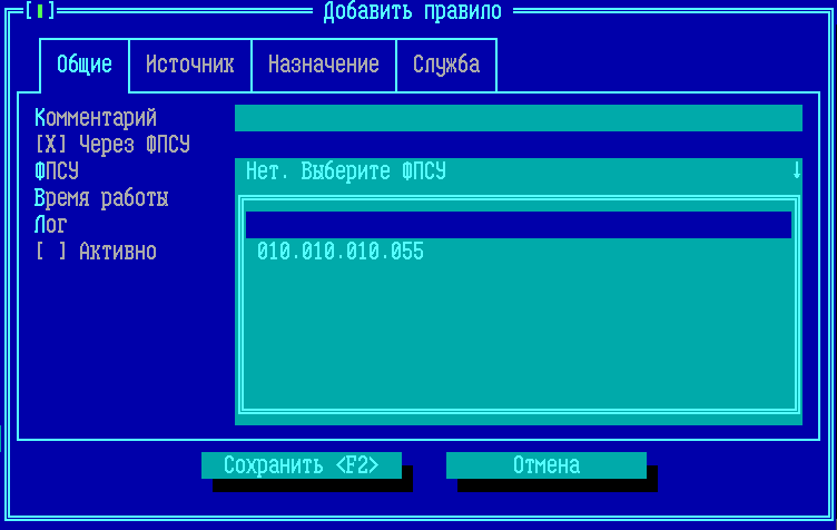 Комментарий – обязательное текстовое поле для пояснения правила. Через ФПСУ – при установлении флага пакеты, подпадающие под данное правило трафика, будут отправляться в туннель между ФПСУ. Название поля ниже поменяется на «ФПСУ», в этом поле следует выбрать ФПСУ из списка, описанных на портах ФПСУ.