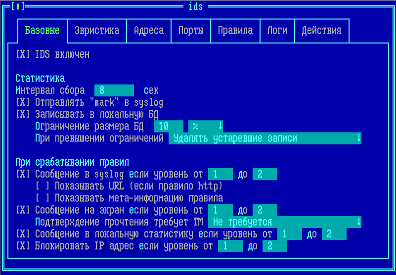 В окне «ids» находятся вкладки с настраиваемыми параметрами системы IDS. Переход с активной вкладки на соседнюю осуществляется установлением курсора на вкладку и нажатием сочетаний клавиш <Ctrl →> и <Ctrl ←> или клавиш <→> и <←>. По умолчанию система IDS отключена на ФПСУ. Для включения системы необходимо включить флаг «IDS включен» на вкладке «Базовые», задать значение адреса HOME_NET на вкладке «Адреса», рекомендуется настроить источник обновления правил на вкладке «Правила».