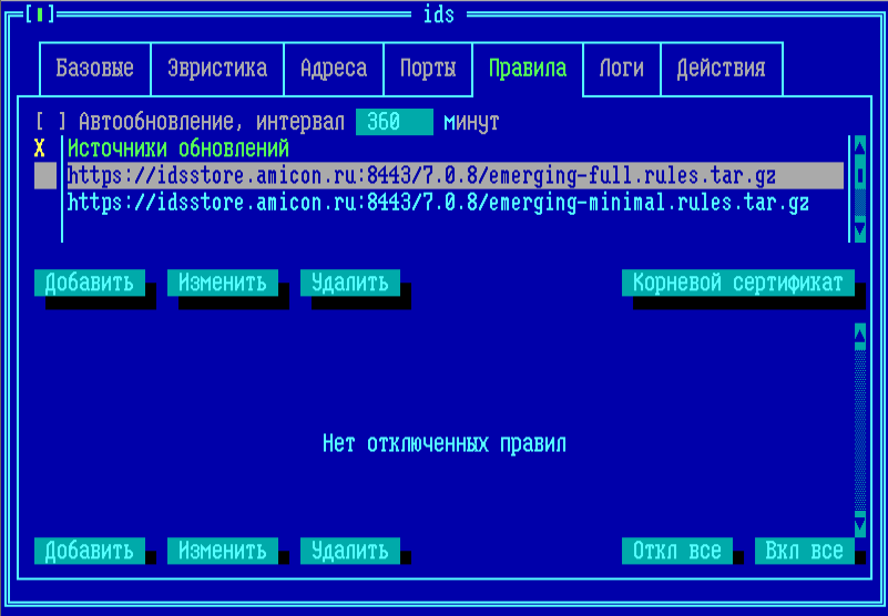 На вкладке Правила задаются источники обновлений правил IDS и правила, отключаемые при проверке пакетов.