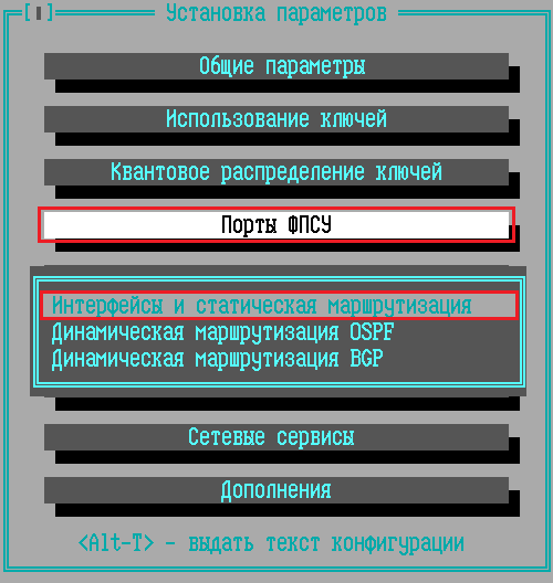 Команда «Порты ФПСУ» меню конфигурации предназначена для задания основных правил фильтрации и маршрутизации абонентского трафика, и указания способа последующей передачи данных через ФПСУ. Маршрутизация на портах может задаваться статически в конфигурации, а может быть получена с помощью протоколов динамической маршрутизации. Далее описываются настройки для статической маршрутизации. Описание работы с динамической маршрутизацией находится в разделе «Динамическая маршрутизация OSPF».