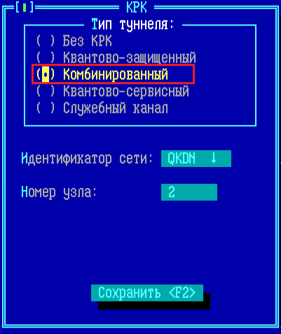 Имя – произвольное название, необязательный параметр. При выборе комбинированного туннеля в окне КРК будет предложено имя %идентификатор_сети%-%номер_соседнего_узла% в скобках добавится обозначение туннеля (QKDN-2 (QC) на примере);