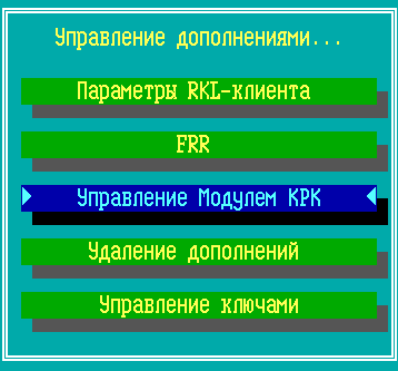 В режиме конфигурации меню параметры модуля AMI-QKD открывается из пункта меню «Настройка дополнений → Управление модулем КРК»: