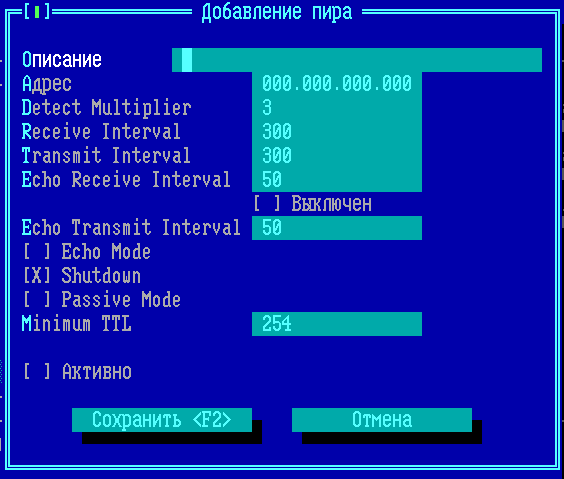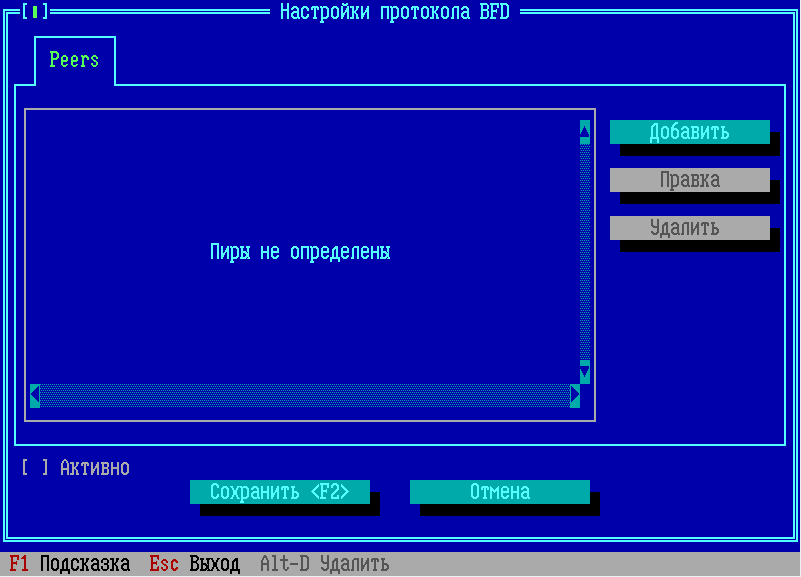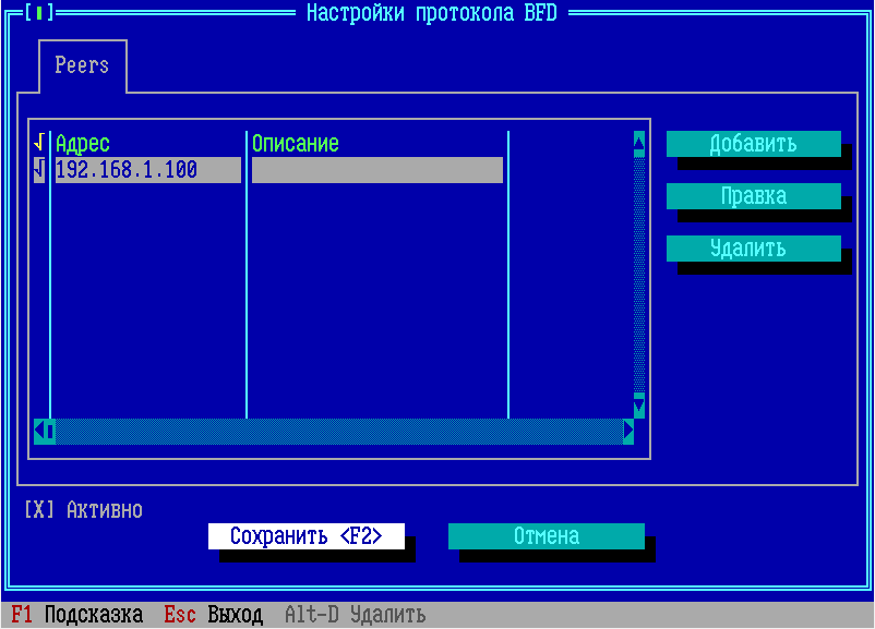 Для выхода в меню с сохранением настроек протокола BFD, нажмите кнопку «Сохранить» или клавишу <F2>. Для выхода без сохранения настроек нажмите клавишу <Esc>.