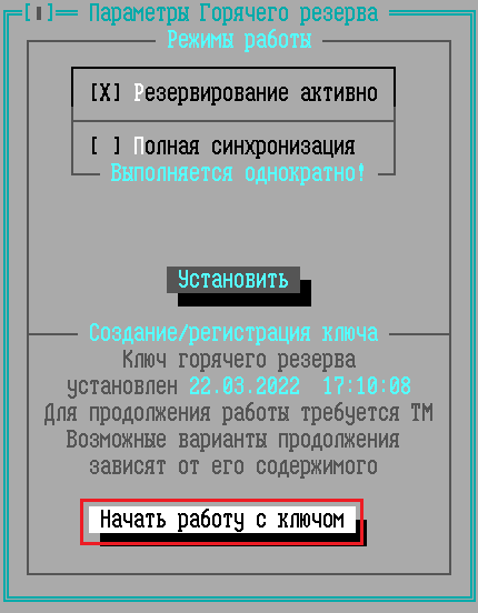 Для замены ключа горячего резерва следует выполнить следующие действия, начиная с основного ФПСУ системы резервирования: 1. В окне «Параметры Горячего резерва» основного ФПСУ нажмите кнопку «Начать работу с ключом»: