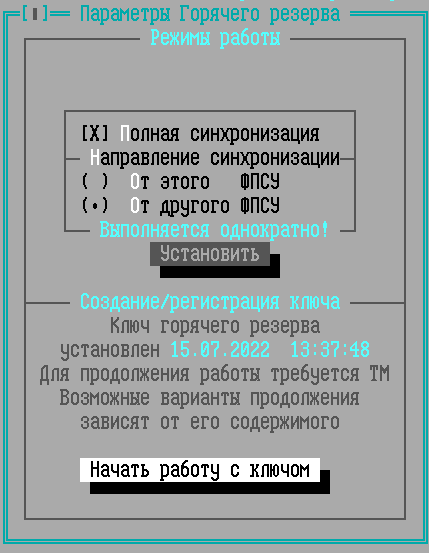 6. Перейдите к конфигурированию резервного ФПСУ. В окне «Параметры Горячего резерва» резервного ФПСУ нажмите кнопку «Начать работу с ключом»;