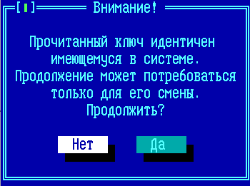 На экран будет выдано сообщение об уже имеющемся ключе горячего резерва, записанном на ТМ-идентификатор. Для смены ключа горячего резерва требуется нажать кнопку «Да»;