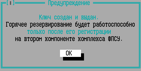 5. Ключ горячего резерва будет создан и начнется его запись в предъявленный ТМ-идентификатор. В случае успешной записи ключа горячего резерва появится служебное предупреждение: