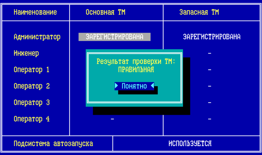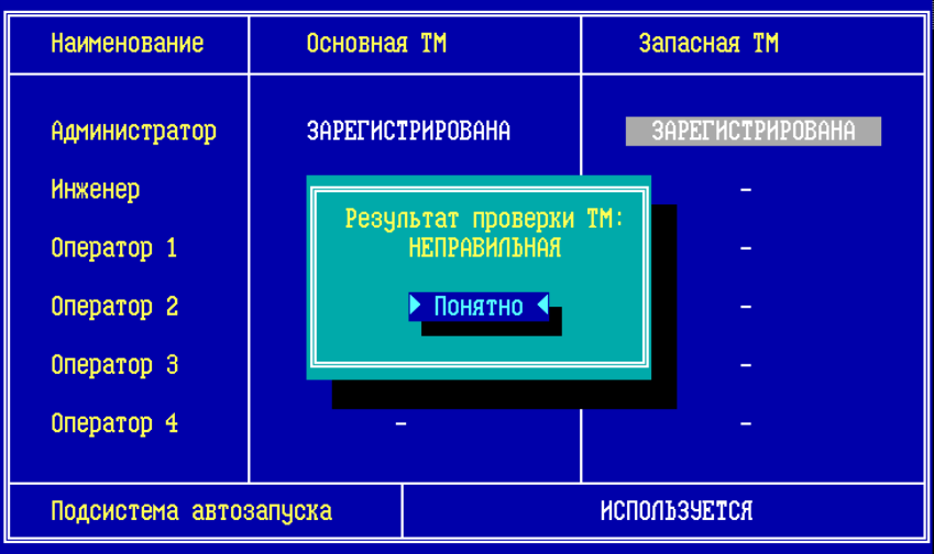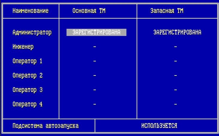 При выполнении команда вызывает окно регистрации ТМ-идентификаторов, из которого доступны следующие операции: •регистрация ТМ-идентификаторов новых локальных администраторов ФПСУ; •управление паролями для учетных записей локальных администраторов ФПСУ; •удаление записанной на потерявших актуальность или скомпрометированных ТМ-идентификаторах ключевой информации; •проверка ТМ-идентификаторов на исправность и корректность хранимой в них информации; •включение или отключение подсистемы автозапуска ФПСУ (см. пункты «Включение автозапуска ФПСУ» и «Отключение автозапуска»). Окно регистрации ТМ содержит таблицу, показывающую наличие зарегистрированных ТМ-идентификаторов, а также состояние подсистемы автозапуска. ВНИМАНИЕ! Ячейке таблицы [пусто] «Администратор» - «Основная ТМ» соответствует пользователь класса «Главный администратор». Ячейке таблицы [пусто] «Администратор» - «Запасная ТМ» соответствует пользователь класса «Администратор». Ячейкам таблицы строки «Инженер» соответствуют пользователи класса «Инженер». Ячейкам таблицы строк «Оператор 1», «Оператор 2», «Оператор 3» и «Оператор 4» соответствуют пользователи класса «Оператор».