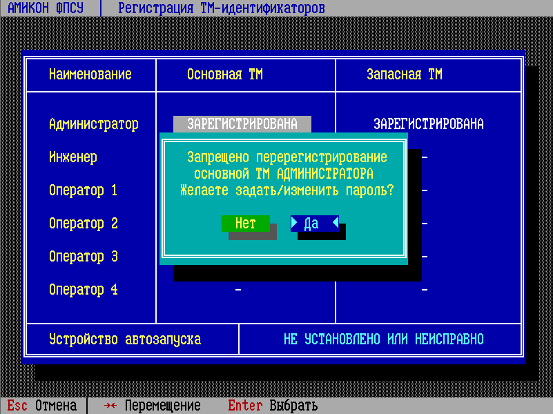 Для установки пароля Главного администратора: выделите ячейку Администратор-Основная ТМ и нажмите клавишу <Ins>, на экране отобразится запрос на задание/изменение пароля основного ТМ. Нажмите «Да» для задания пароля: