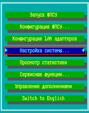 Локальному администратору ФПСУ классов «Администратор» или «Главный администратор» доступна возможность форматирования внутреннего накопителя ФПСУ с удалением операционной системы ФПСУ и хранящихся файлов, в том числе ключевой информации СКЗИ, программных и служебных модулей СКЗИ, и программного обеспечения BIOS/UEFI. Для запуска процедуры форматирования внутреннего накопителя: 1. Выполните команду «Настройка системы» главного меню:
