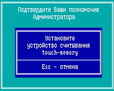 Если USB ТМ-идентификатор TM-Key не был подключен к ФПСУ, появится окно с предложением подтвердить полномочия администратора или Главного администратора (права классов «Администратор» или «Главный администратор», см. пункт «Разграничение доступа и пользователи»). ВНИМАНИЕ! Сразу после приложения к ТМ-считывателю ФПСУ ТМ-идентификатора, подтверждающего права классов «Администратор» или «Главный администратор», будет запущен необратимый процесс форматирования внутреннего накопителя!