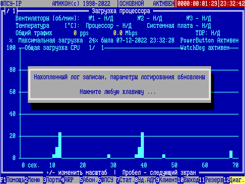 После нажатия комбинации клавиш <Alt+L> на экран ФПСУ будет выдано сообщение о записи лога, при записи диагностики mlog на экране ФПСУ отображается индикация активности красным цветом, показывающая продолжительность записи mlog и текущее время на ФПСУ.