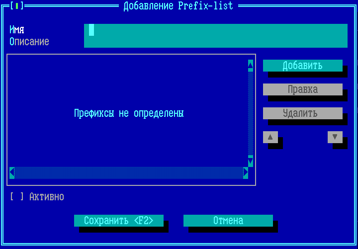 На вкладке Prefix-list описываются списки префиксов. Применяется при описании BGP-узла и в карте маршрутов. Для создания prefix-list необходимо во вкладке нажать кнопку «Добавить».