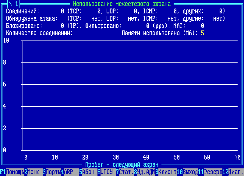 Межсетевой экран осуществляет контроль и фильтрацию проходящего через него сетевого трафика в соответствии с заданными правилами. В мониторинге межсетевого экрана выводится отчет об активных соединениях с использованием протоколов транспортного и сетевого уровня, обнаруженных сетевых атаках, блокированных пакетах, скорости фильтрации в пакетах в секунду, используемой памяти для NAT-трансляции в мегабайтах, общем количестве соединений и используемой памяти. По нажатию клавиши <Пробел> в окне «Использование межсетевого экрана» осуществляется переход в режим отображения накопленной с начала суток статистики. Текущая дата отображается вверху окна.