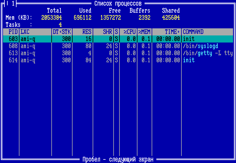 В окне отображаются сведения о процессах, запущенных подсистемой http-прокси, другими подсистемами и опциональными дополнениями к ПО ФПСУ. Данные аналогичны выводу консольной утилиты top в Linux. По нажатию клавиши <Пробел> на экране «Список процессов» осуществляется возврат в стартовое окно «Загрузка процессора». В процессе работы (после перехода в другие информационные окна режима фильтрации) в окно «Загрузка процессора» можно вернуться по нажатию <F7>. |