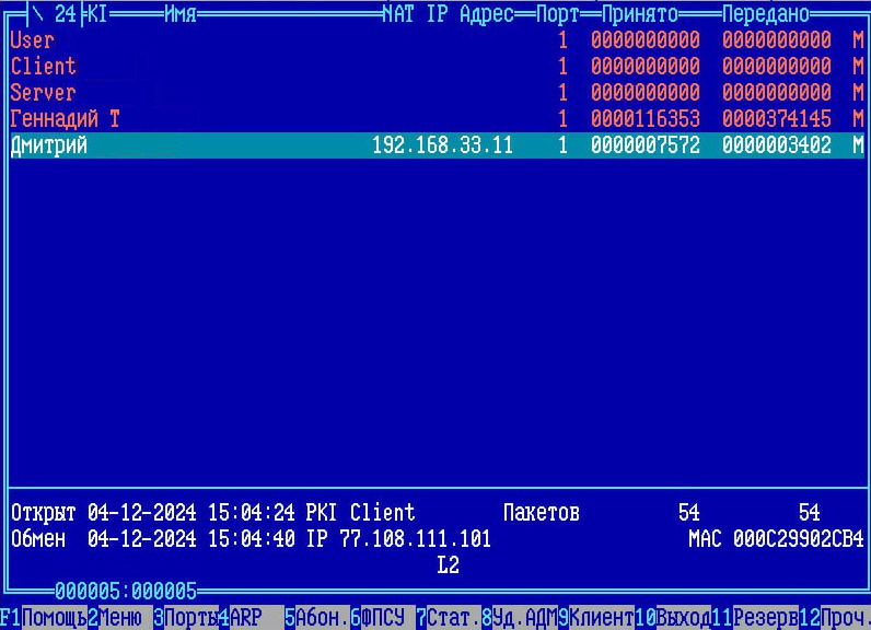 Для просмотра информации о текущем взаимодействии ФПСУ с программными и программно-аппаратными комплексами ФПСУ-IP/Клиент, нажмите <F9>. Для каждого ФПСУ-IP/Клиента, работающего в текущий момент времени через ФПСУ, отображаются: •имя, данное ФПСУ-IP/Клиенту администратором Криптосети Клиентов при генерации ключей ФПСУ-IP/Клиента; •IP-адрес ФПСУ-IP/Клиента, присвоенный ему администратором ФПСУ (статический NAT-адрес для работы ФПСУ-IP/Клиента в защищенном сегменте IP-сети); •номер порта ФПСУ, с которым соединён ФПСУ-IP/Клиент в настоящее время; •количество байт данных, принятых от ФПСУ-IP/Клиента и переданных ему с ФПСУ; •маркер, указывающий на алгоритм шифрования данных: P – пакетное шифрование данных, отображается только когда к ФПСУ подключен ФПСУ-IP/Клиент с версией программного обеспечения ниже 5.0 (использующий СКЗИ «Туннель 2.0»), передаваемые данные между ФПСУ и ФПСУ-IP/Клиентом шифруются по алгоритму ГОСТ 28147-89; m – передаваемые данные между ФПСУ и ФПСУ-IP/Клиентом шифруются по алгоритму «Магма»; М – передаваемые данные между ФПСУ и ФПСУ-IP/Клиентом шифруются по алгоритму «Магма MGM»; C – при передаче данных используется сжатие.