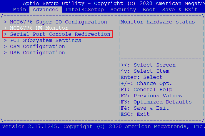 В примере рассматривается утилита настройки BIOS - Apatio Setup Utility, используемой на аппаратных платформах семейств FPSUIP-STD3, FPSUIP-EXT3, FPSUIP-ORD3. Название значимых параметров может отличаться от приведенных выше. Откройте утилиту Apatio, перейдите на вкладку Advanced, выберите пункт Serial Port Console Redirection.