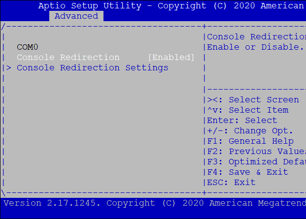В открывшемся окне активируйте опцию Console Redirection, установив в значение Enabled. Выберите пункт Console Redirection Settings.