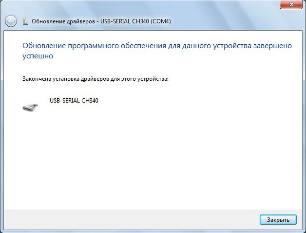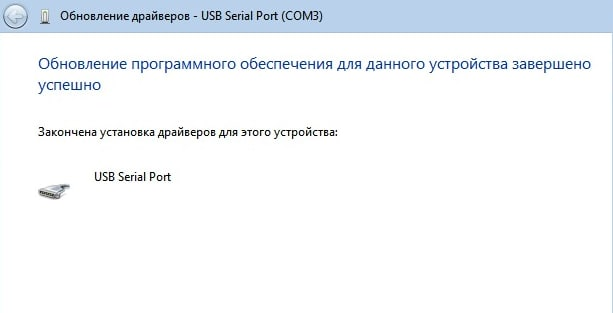 Требуется еще раз запустить установку драйвера из той же папки. В диспетчере устройств выберите неопознанное устройство USB Serial Port и по нажатию правой кнопки мыши в контекстном меню выберите пункт «Обновить драйверы» для этого устройства.