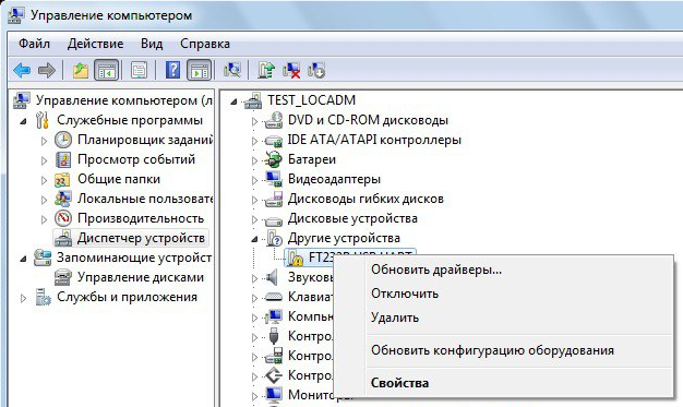 Загрузите и распакуйте архив с файлами драйвера в отдельный каталог. В диспетчере устройств выберите неопознанное устройство FT232R USB UART и по нажатию правой кнопки мыши в контекстном меню выберите пункт «Обновить драйверы» для этого устройства.