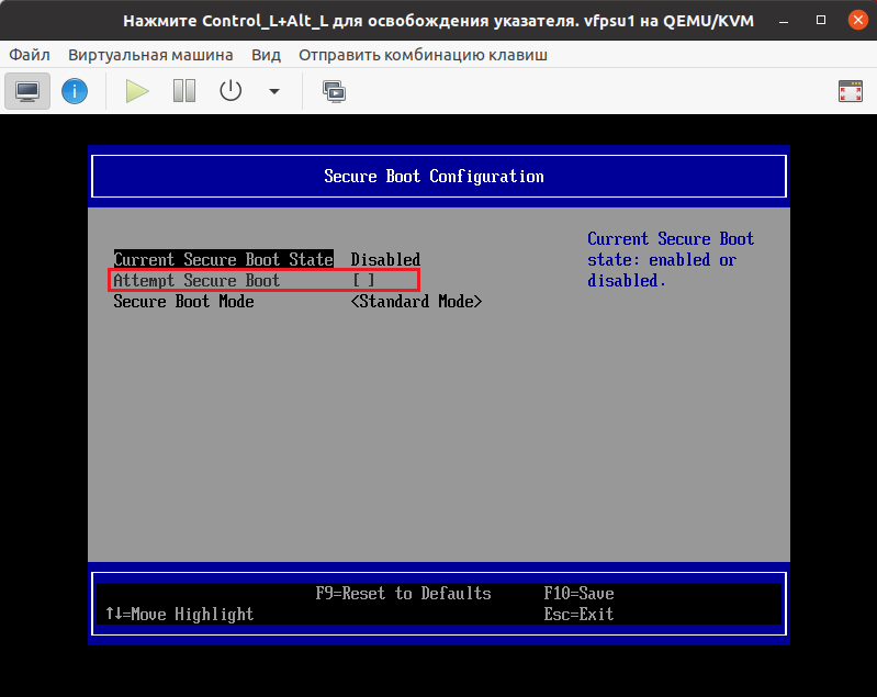 Закройте окно виртуальной машины. В некоторых случаях необходимо отключить безопасную загрузку UEFI. Для этого при загрузке виртуальной машины, нажать <F2>, зайти в настройки BIOS, выбрать в меню «Device Manager → Secure Boot Configuration», выбрать опцию «Attempt Secure Boot» и снять флаг, выйти из BIOS с сохранением изменений по <F10>.