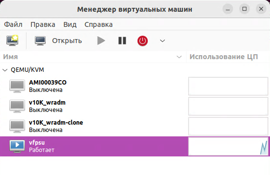 В данном разделе описывается подготовка виртуальной машины QEMU/KVM для развертывания ФПСУ. Виртуальные машины могут эксплуатироваться под управлением следующих хостовых ОС: Windows 7 х64, Windows 8.1 x64, Windows 10 x64, Windows 11 x64, Windows Server 2019 x64, ubuntu 22.04 LTS x86-64, ubuntu 24.04 LTS x86-64, Debian 12 x86-64, Debian 13 x86-64, Astra Linux SE 1.7.4 x86-64, REDOS 8 x86-64. Поддерживаемые версии QEMU: 6.2.0, 7.0.0, 7.1.0, 8.0.0, 8.1.0, 8.2.0. В операционной системе семейства Linux должна быть установлена программа эмуляции аппаратной платформы QEMU. Для использования аппаратной виртуализации KVM необходимо: •установить библиотеки и ПО; •настроить доступ к управлению виртуальной машиной; •создать виртуальную машину с гостевой операционной системой ФПСУ; •настроить сетевые интерфейсы и другие устройства. Далее приводится пример установки ФПСУ в QEMU/KVM 6.2.0 на Ubuntu 22.04.4 LTS. QEMU/KVM 6.2.0 предварительно установлена. Предварительно установлены пакеты libvirt-clients версии 8.0.0-1ubuntu7.10 amd64, libvirt-daemon-system версии 8.0.0-1ubuntu7.10 amd64, bridge-utils версии 1.7-1ubuntu3 amd64. Необходимо проверить, поддерживаются ли рабочей станцией необходимые расширения виртуализации для KVM. Для процессоров Intel должна поддерживаться технология Intel VT, для процессоров AMD – AMD SVM. Введите команду в терминале: kvm-ok Если виртуализация поддерживается и включена в BIOS/UEFI, на экран будет выдано сообщение о возможности использовать KVM. INFO: /dev/kvm exists KVM acceleration can be used В случае, если в сообщении указано что ускорение KVM не может быть использовано, а процессор поддерживает виртуализацию, проверьте, что аппаратная виртуализация включена в BIOS/UEFI материнской платы компьютера. Если процессор не поддерживает аппаратную виртуализацию, в выводе команды терминала будет возвращено значение 0. egrep -c '(vmx | svm)' /proc/cpuinfo После установки qemu необходимо настроить доступ к управлению виртуальной машиной. Добавить группу libvirtd и добавить пользователя в эту группу для управления виртуальными машинами. Данный пользователь получит доступ к расширенным сетевым опциям. Введите команды в терминале: sudo groupadd libvirtd sudo adduser $USER libvirtd Если в качестве пользователя выбран текущий, потребуется выйти из системы и войти снова, чтобы применить новое членство в группе. Проверить членство в группе можно командой: groups <имя пользователя> Включите поддержку встроенного ПО UEFI для виртуальной машины QEMU/KVM, установив пакет ovmf, если не установлен: sudo apt install ovmf sudo cp /usr/share/OVMF/OVMF_CODE.fd /var/lib/libfirt/ Версия устанавливаемого пакета ovmf 2022.02-3ubuntu0.22.04.3. Для автоматизации процесса установки ОС используется утилита virt-install, могут быть использованы preseeds, kickstart и пр. Утилита virt-install является частью пакета virtinst. Данный пакет был установлен ранее. Версия установленного пакета virtinst 4.0.0-1. Запустите гостевую операционную систему ФПСУ в виртуальной машине QEMU/KVM, vfpsu, выполнив команду в терминале: sudo virt-install --name vfpsu --memory 2048 --disk vfpsu.qcow2,size=1 --osinfo detect=off,require=off --import --boot loader=$(pwd)/OVMF_CODE.fd,bootmenu.enable=on,bios.useserial=on --network none Примечание. Параметр size=1 следует убрать, если используется готовый образ диска на USB-носителе.