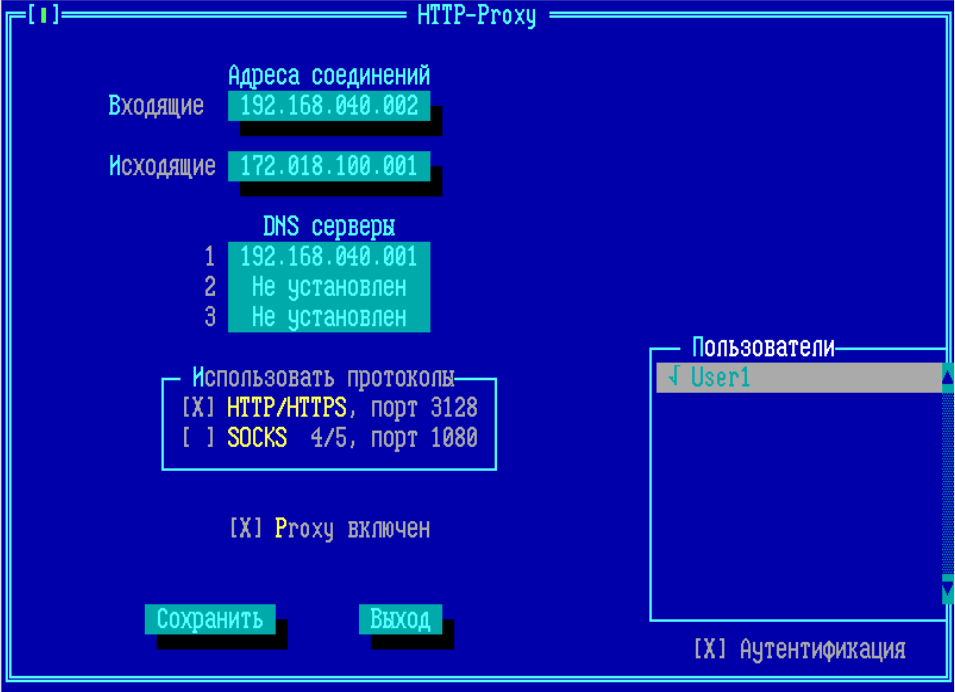 После сохранения указанных настроек, только пользователь, указавший логин учетной записи прокси User1 и корректный пароль к ней, сможет воспользоваться работой через прокси ФПСУ. Успешные и не успешные попытки авторизации пользователей на прокси ФПСУ записываются в статистику. Удаление учетной записи пользователя осуществляется клавишей <Del> при установленном на удаляемой учетной записи пользователя курсоре. Для выхода из окна и возвращение в меню конфигурации ФПСУ с сохранением выполненных настроек, нажмите кнопку «Сохранить» или клавишу <F2>. Для выхода из окна и возвращение в меню конфигурации ФПСУ без внесения в конфигурацию сделанных изменений, нажмите кнопку «Выход» или клавишу <Esc>. |