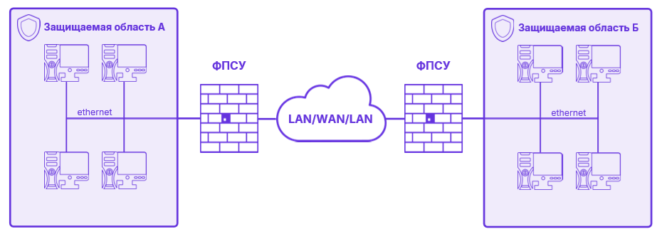 ФПСУ подключается в cеть передачи данных между защищаемой областью и остальной частью сети таким образом, чтобы все входящие и исходящие из области потоки данных проходили через ФПСУ. Если защищаемая область связана с остальной сетью передачи данных более чем в одной точке (транзитная область), ФПСУ следует устанавливать на каждом выходе из неё.